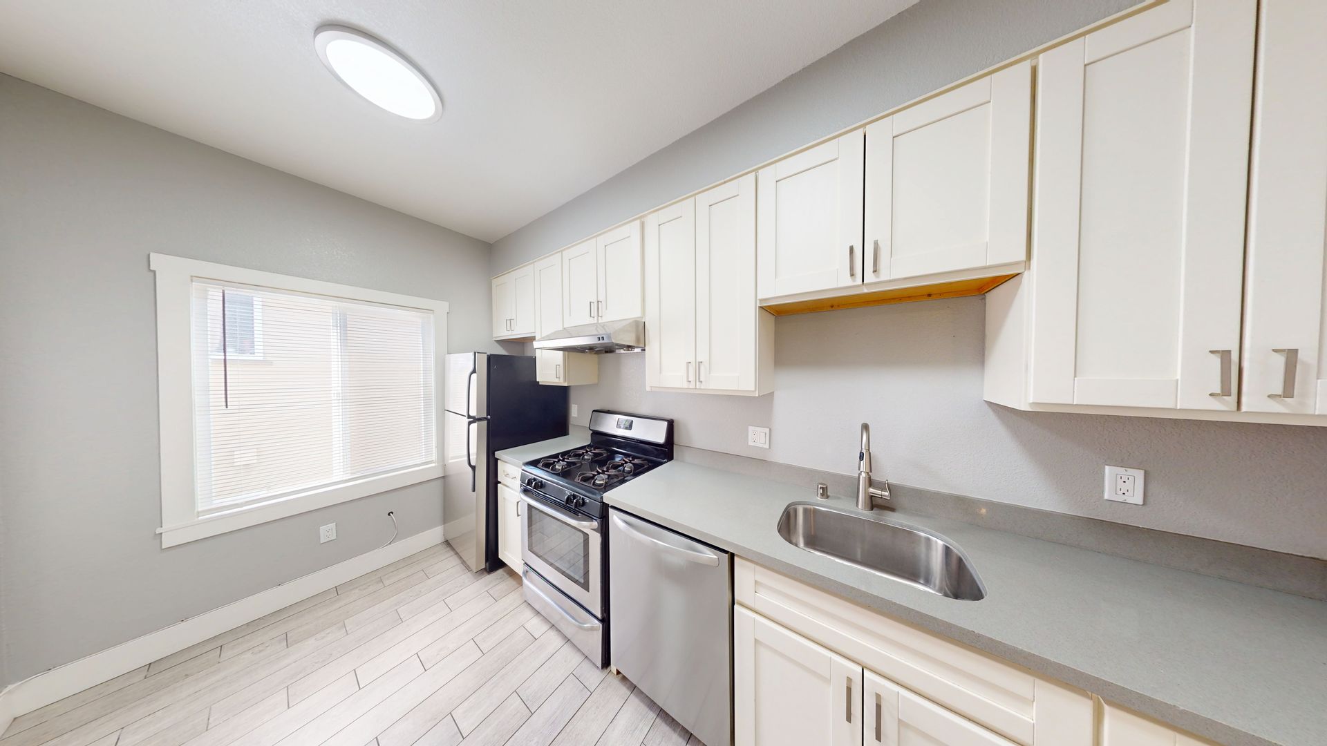 • Functional Kitchen: counter and plenty of storage, with stainless steel appliances.